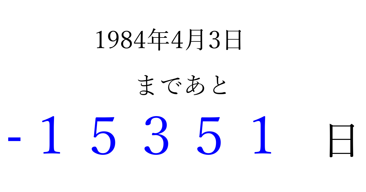 1984年4月3日(火)は もう 00000 日過ぎました 追加すると、トップページからすぐ選べるようになります ※2026/04/14現在の結果です。 最新の状態に更新する ↓シェアして、タイムライン上にカウントダウンを表示しよう!↓ 📤 この結果を共有する Tweet シェア Threads Bluesky 別の日付でカウントダウン 1984年4月のカレンダー このページをブックマークに追加すると、いつでもカウントダウンを確認できます。 (PC: Ctrl+D / Mac: ⌘+D) hitome-notes.comでは以下のページも運営しています。 指定日と期間から日付を計算 | ガチャ確率計算・シミュレーション | プライバシー・ポリシー 運営者:Avocado