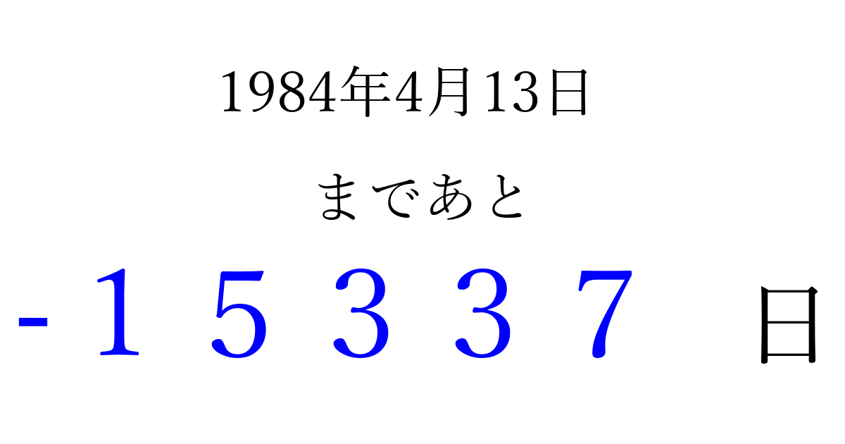 1984年4月13日(金)は もう 00000 日過ぎました 追加すると、トップページからすぐ選べるようになります ※2026/04/10現在の結果です。 最新の状態に更新する ↓シェアして、タイムライン上にカウントダウンを表示しよう!↓ 📤 この結果を共有する Tweet シェア Threads Bluesky 別の日付でカウントダウン 1984年4月のカレンダー このページをブックマークに追加すると、いつでもカウントダウンを確認できます。 (PC: Ctrl+D / Mac: ⌘+D) hitome-notes.comでは以下のページも運営しています。 指定日と期間から日付を計算 | ガチャ確率計算・シミュレーション | プライバシー・ポリシー 運営者:Avocado