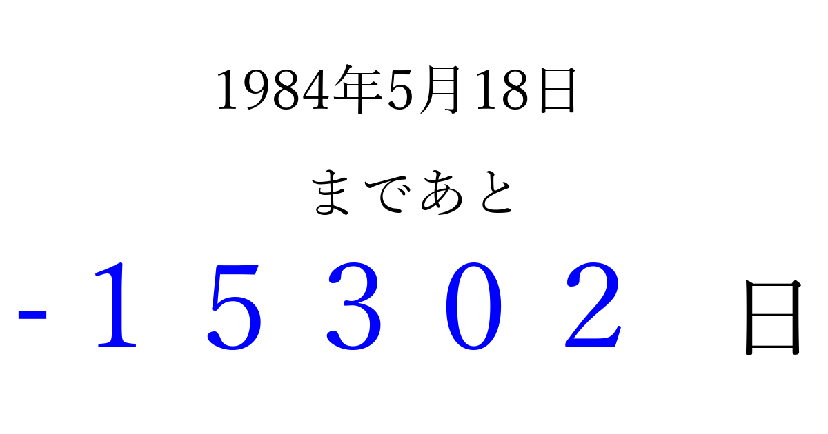 1984年5月18日(金)は もう 00000 日過ぎました 追加すると、トップページからすぐ選べるようになります ※2026/04/10現在の結果です。 最新の状態に更新する ↓シェアして、タイムライン上にカウントダウンを表示しよう!↓ 📤 この結果を共有する Tweet シェア Threads Bluesky 別の日付でカウントダウン 1984年5月のカレンダー このページをブックマークに追加すると、いつでもカウントダウンを確認できます。 (PC: Ctrl+D / Mac: ⌘+D) hitome-notes.comでは以下のページも運営しています。 指定日と期間から日付を計算 | ガチャ確率計算・シミュレーション | プライバシー・ポリシー 運営者:Avocado