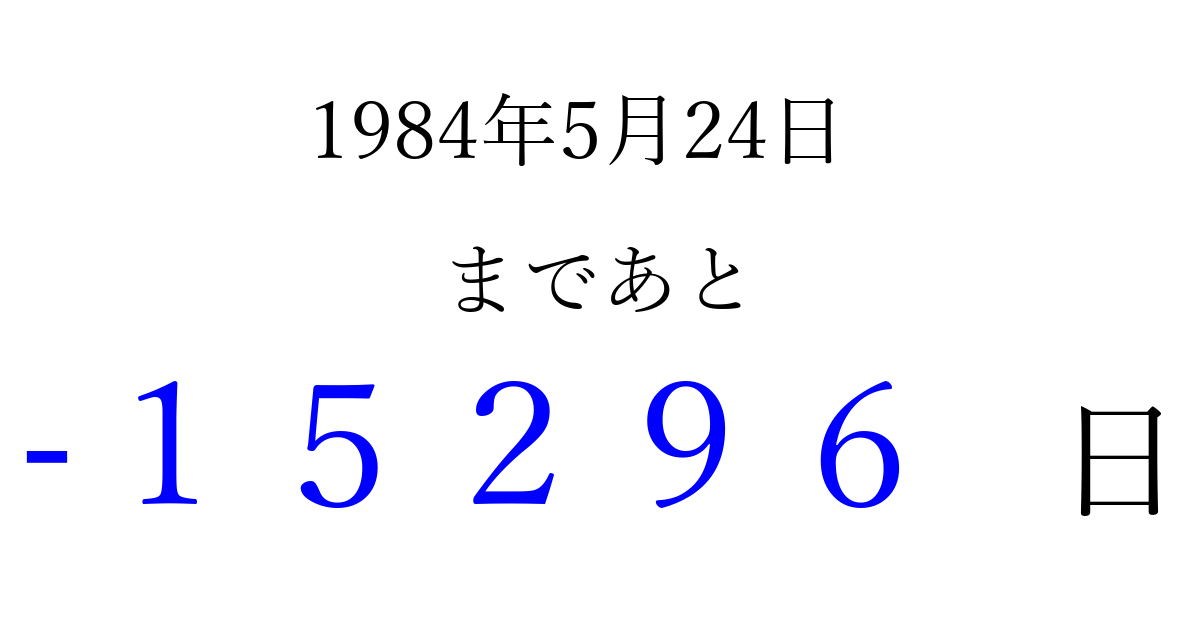 1984年5月24日(木)は もう 00000 日過ぎました 追加すると、トップページからすぐ選べるようになります ※2026/04/10現在の結果です。 最新の状態に更新する ↓シェアして、タイムライン上にカウントダウンを表示しよう!↓ 📤 この結果を共有する Tweet シェア Threads Bluesky 別の日付でカウントダウン 1984年5月のカレンダー このページをブックマークに追加すると、いつでもカウントダウンを確認できます。 (PC: Ctrl+D / Mac: ⌘+D) hitome-notes.comでは以下のページも運営しています。 指定日と期間から日付を計算 | ガチャ確率計算・シミュレーション | プライバシー・ポリシー 運営者:Avocado