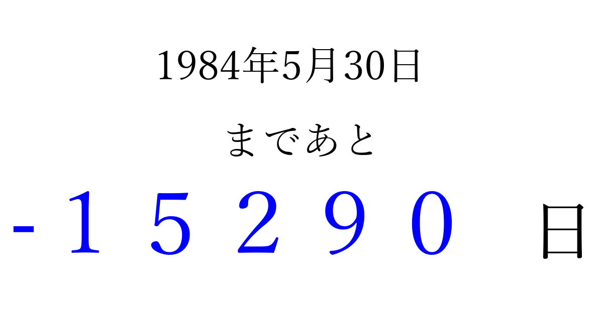 1984年5月30日(水)は もう 00000 日過ぎました 追加すると、トップページからすぐ選べるようになります ※2026/04/10現在の結果です。 最新の状態に更新する ↓シェアして、タイムライン上にカウントダウンを表示しよう!↓ 📤 この結果を共有する Tweet シェア Threads Bluesky 別の日付でカウントダウン 1984年5月のカレンダー このページをブックマークに追加すると、いつでもカウントダウンを確認できます。 (PC: Ctrl+D / Mac: ⌘+D) hitome-notes.comでは以下のページも運営しています。 指定日と期間から日付を計算 | ガチャ確率計算・シミュレーション | プライバシー・ポリシー 運営者:Avocado