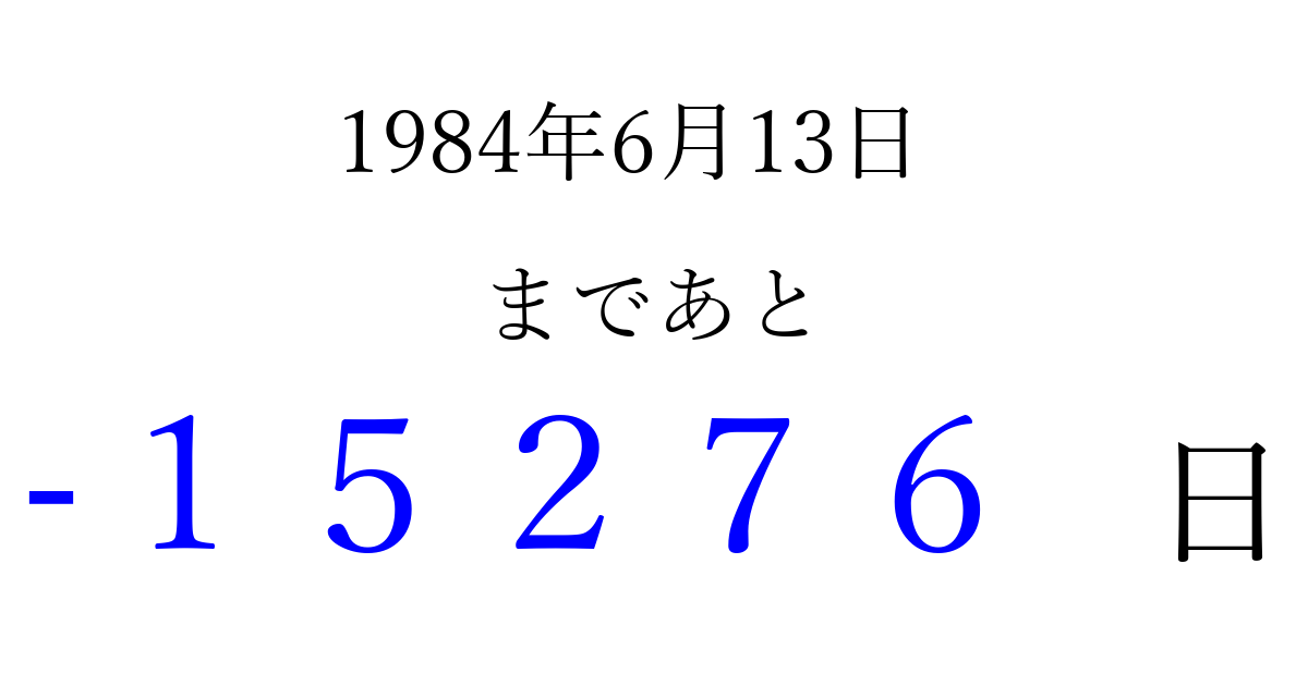 1984年6月13日(水)は もう 00000 日過ぎました 追加すると、トップページからすぐ選べるようになります ※2026/04/10現在の結果です。 最新の状態に更新する ↓シェアして、タイムライン上にカウントダウンを表示しよう!↓ 📤 この結果を共有する Tweet シェア Threads Bluesky 別の日付でカウントダウン 1984年6月のカレンダー このページをブックマークに追加すると、いつでもカウントダウンを確認できます。 (PC: Ctrl+D / Mac: ⌘+D) hitome-notes.comでは以下のページも運営しています。 指定日と期間から日付を計算 | ガチャ確率計算・シミュレーション | プライバシー・ポリシー 運営者:Avocado