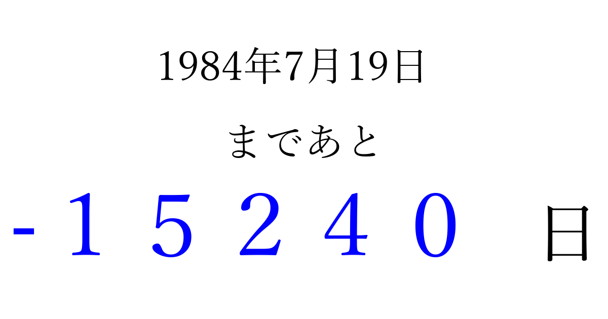 1984年7月19日(木)は もう 00000 日過ぎました 追加すると、トップページからすぐ選べるようになります ※2026/04/10現在の結果です。 最新の状態に更新する ↓シェアして、タイムライン上にカウントダウンを表示しよう!↓ 📤 この結果を共有する Tweet シェア Threads Bluesky 別の日付でカウントダウン 1984年7月のカレンダー このページをブックマークに追加すると、いつでもカウントダウンを確認できます。 (PC: Ctrl+D / Mac: ⌘+D) hitome-notes.comでは以下のページも運営しています。 指定日と期間から日付を計算 | ガチャ確率計算・シミュレーション | プライバシー・ポリシー 運営者:Avocado