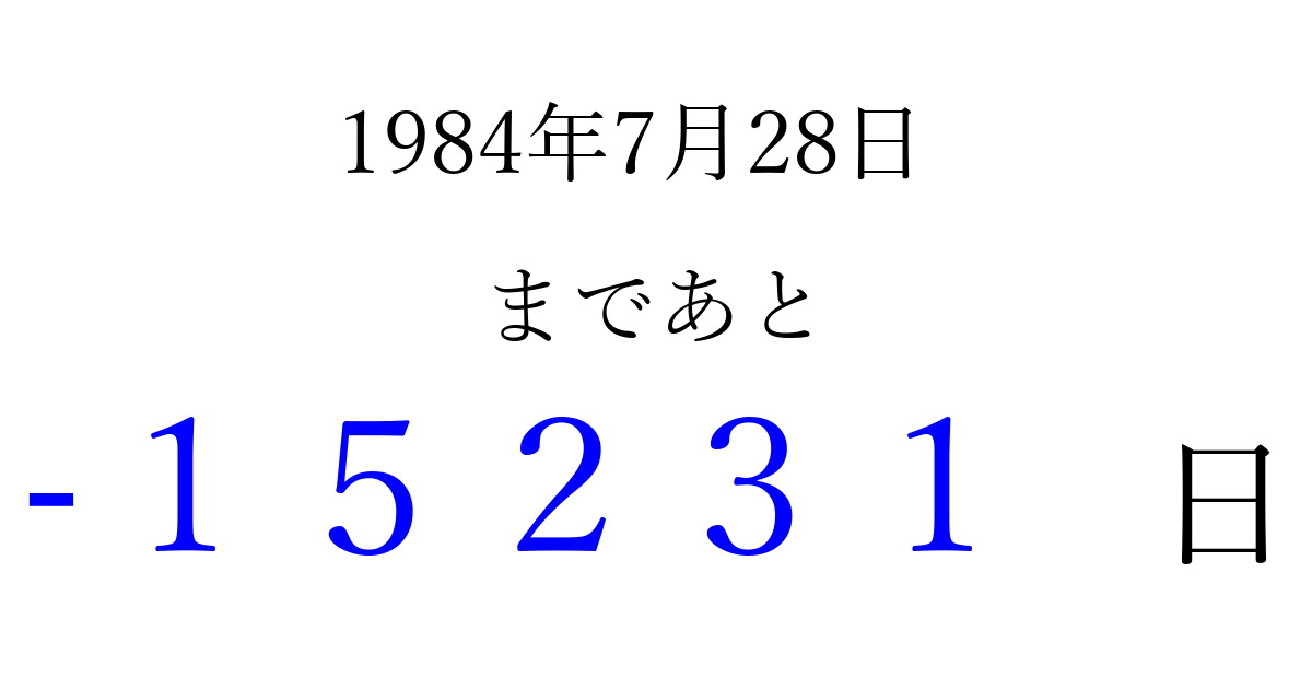 1984年7月28日(土)は もう 00000 日過ぎました 追加すると、トップページからすぐ選べるようになります ※2026/04/10現在の結果です。 最新の状態に更新する ↓シェアして、タイムライン上にカウントダウンを表示しよう!↓ 📤 この結果を共有する Tweet シェア Threads Bluesky 別の日付でカウントダウン 1984年7月のカレンダー このページをブックマークに追加すると、いつでもカウントダウンを確認できます。 (PC: Ctrl+D / Mac: ⌘+D) hitome-notes.comでは以下のページも運営しています。 指定日と期間から日付を計算 | ガチャ確率計算・シミュレーション | プライバシー・ポリシー 運営者:Avocado