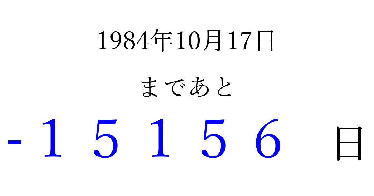 1984年10月17日(水)は もう 00000 日過ぎました 追加すると、トップページからすぐ選べるようになります ※2026/04/16現在の結果です。 最新の状態に更新する ↓シェアして、タイムライン上にカウントダウンを表示しよう!↓ 📤 この結果を共有する Tweet シェア Threads Bluesky 別の日付でカウントダウン 1984年10月のカレンダー このページをブックマークに追加すると、いつでもカウントダウンを確認できます。 (PC: Ctrl+D / Mac: ⌘+D) hitome-notes.comでは以下のページも運営しています。 指定日と期間から日付を計算 | ガチャ確率計算・シミュレーション | プライバシー・ポリシー 運営者:Avocado