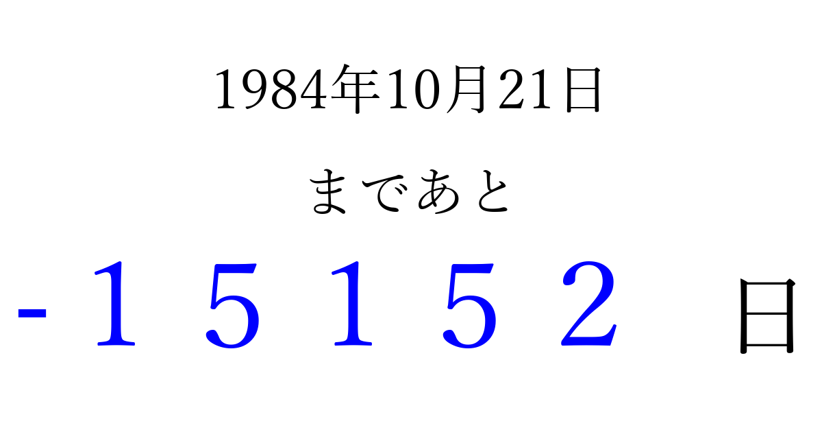 1984年10月21日(日)は もう 00000 日過ぎました 追加すると、トップページからすぐ選べるようになります ※2026/04/16現在の結果です。 最新の状態に更新する ↓シェアして、タイムライン上にカウントダウンを表示しよう!↓ 📤 この結果を共有する Tweet シェア Threads Bluesky 別の日付でカウントダウン 1984年10月のカレンダー このページをブックマークに追加すると、いつでもカウントダウンを確認できます。 (PC: Ctrl+D / Mac: ⌘+D) hitome-notes.comでは以下のページも運営しています。 指定日と期間から日付を計算 | ガチャ確率計算・シミュレーション | プライバシー・ポリシー 運営者:Avocado