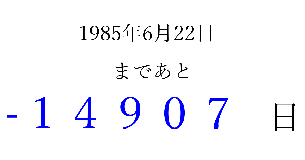 1985年6月22日(土)は もう 00000 日過ぎました 追加すると、トップページからすぐ選べるようになります ※2026/04/15現在の結果です。 最新の状態に更新する ↓シェアして、タイムライン上にカウントダウンを表示しよう!↓ 📤 この結果を共有する Tweet シェア Threads Bluesky 別の日付でカウントダウン 1985年6月のカレンダー このページをブックマークに追加すると、いつでもカウントダウンを確認できます。 (PC: Ctrl+D / Mac: ⌘+D) hitome-notes.comでは以下のページも運営しています。 指定日と期間から日付を計算 | ガチャ確率計算・シミュレーション | プライバシー・ポリシー 運営者:Avocado