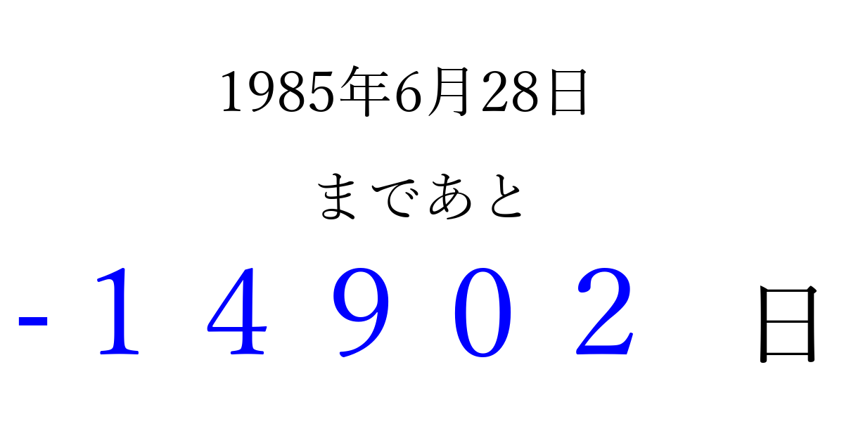 1985年6月28日(金)は もう 00000 日過ぎました 追加すると、トップページからすぐ選べるようになります ※2026/04/16現在の結果です。 最新の状態に更新する ↓シェアして、タイムライン上にカウントダウンを表示しよう!↓ 📤 この結果を共有する Tweet シェア Threads Bluesky 別の日付でカウントダウン 1985年6月のカレンダー このページをブックマークに追加すると、いつでもカウントダウンを確認できます。 (PC: Ctrl+D / Mac: ⌘+D) hitome-notes.comでは以下のページも運営しています。 指定日と期間から日付を計算 | ガチャ確率計算・シミュレーション | プライバシー・ポリシー 運営者:Avocado