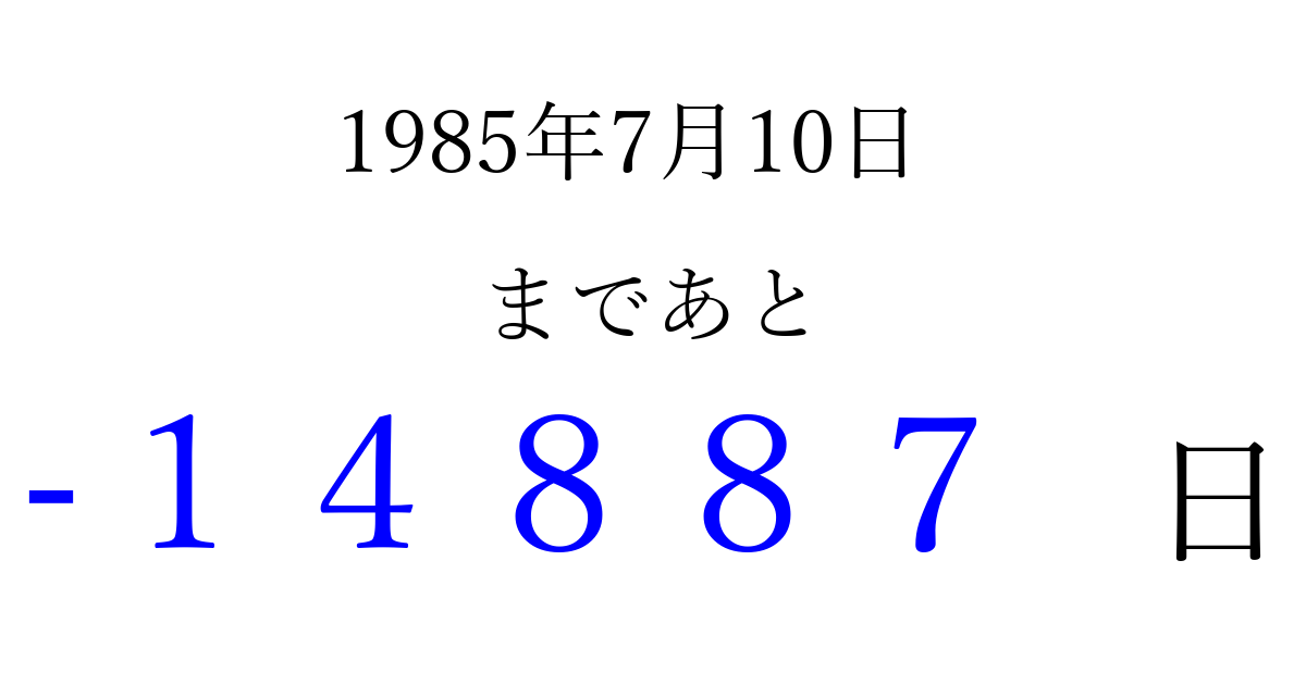 1985年7月10日(水)は もう 00000 日過ぎました 追加すると、トップページからすぐ選べるようになります ※2026/04/13現在の結果です。 最新の状態に更新する ↓シェアして、タイムライン上にカウントダウンを表示しよう!↓ 📤 この結果を共有する Tweet シェア Threads Bluesky 別の日付でカウントダウン 1985年7月のカレンダー このページをブックマークに追加すると、いつでもカウントダウンを確認できます。 (PC: Ctrl+D / Mac: ⌘+D) hitome-notes.comでは以下のページも運営しています。 指定日と期間から日付を計算 | ガチャ確率計算・シミュレーション | プライバシー・ポリシー 運営者:Avocado