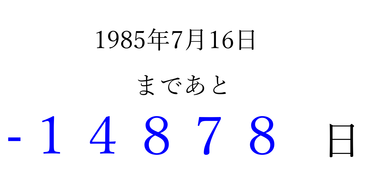1985年7月16日(火)は もう 00000 日過ぎました 追加すると、トップページからすぐ選べるようになります ※2026/04/10現在の結果です。 最新の状態に更新する ↓シェアして、タイムライン上にカウントダウンを表示しよう!↓ 📤 この結果を共有する Tweet シェア Threads Bluesky 別の日付でカウントダウン 1985年7月のカレンダー このページをブックマークに追加すると、いつでもカウントダウンを確認できます。 (PC: Ctrl+D / Mac: ⌘+D) hitome-notes.comでは以下のページも運営しています。 指定日と期間から日付を計算 | ガチャ確率計算・シミュレーション | プライバシー・ポリシー 運営者:Avocado