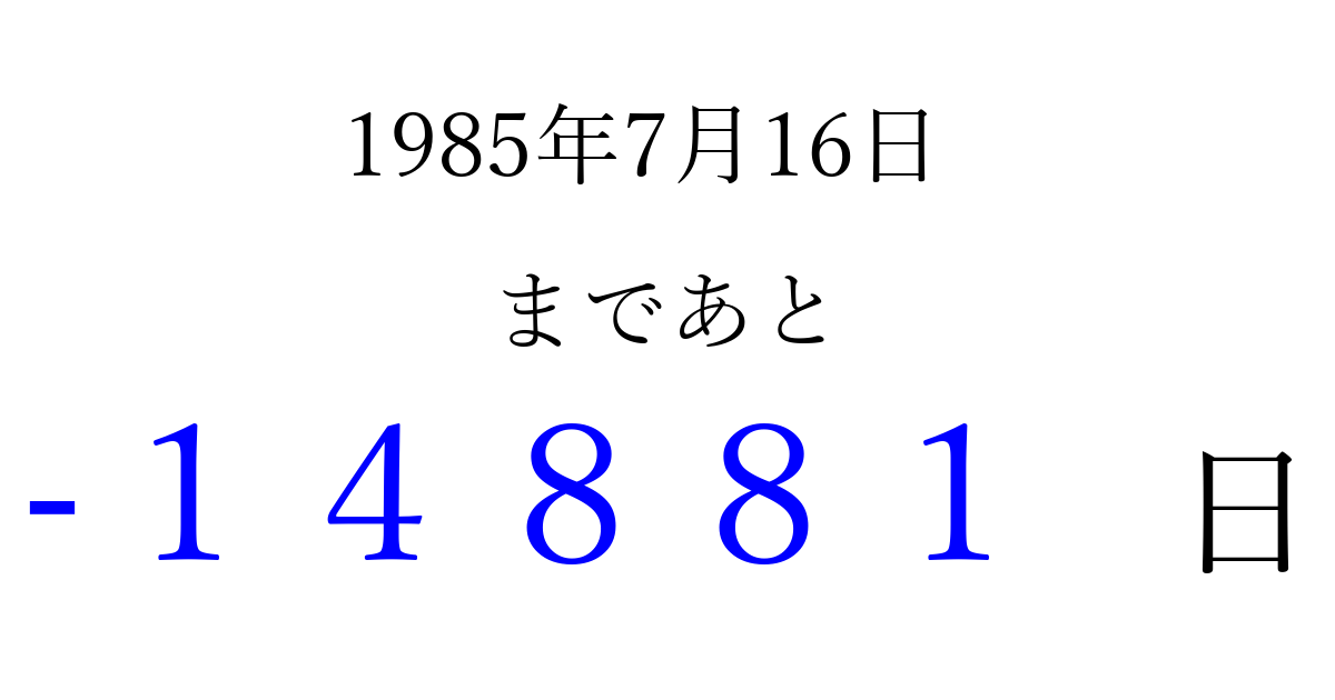 1985年7月16日(火)は もう 00000 日過ぎました 追加すると、トップページからすぐ選べるようになります ※2026/04/13現在の結果です。 最新の状態に更新する ↓シェアして、タイムライン上にカウントダウンを表示しよう!↓ 📤 この結果を共有する Tweet シェア Threads Bluesky 別の日付でカウントダウン 1985年7月のカレンダー このページをブックマークに追加すると、いつでもカウントダウンを確認できます。 (PC: Ctrl+D / Mac: ⌘+D) hitome-notes.comでは以下のページも運営しています。 指定日と期間から日付を計算 | ガチャ確率計算・シミュレーション | プライバシー・ポリシー 運営者:Avocado