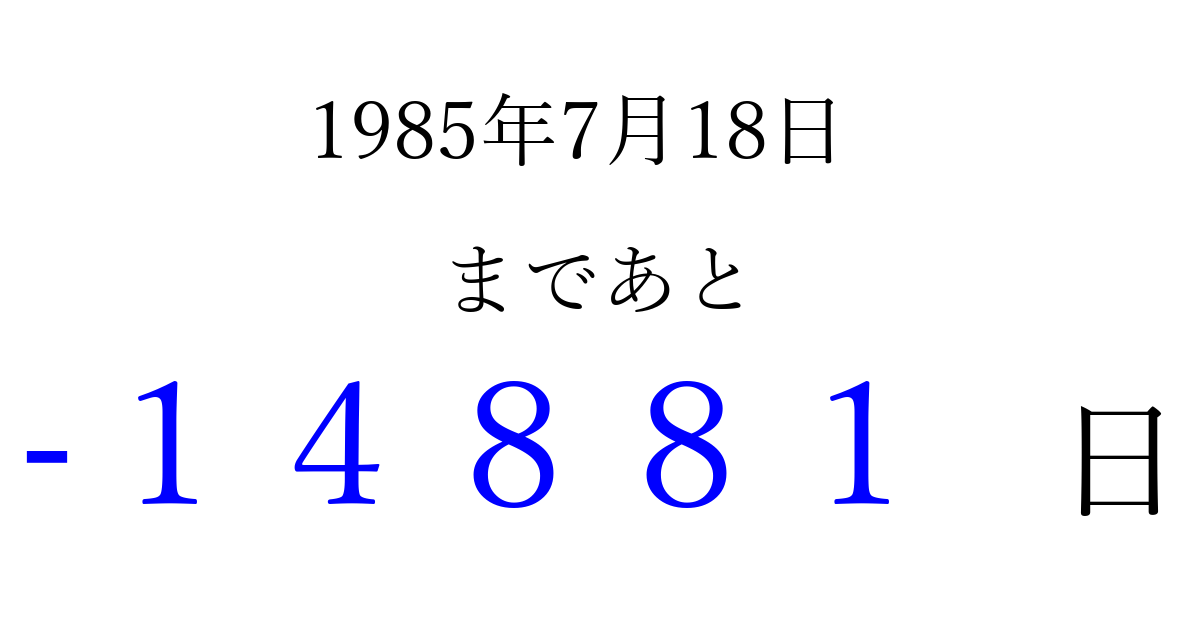 1985年7月18日(木)は もう 00000 日過ぎました 追加すると、トップページからすぐ選べるようになります ※2026/04/15現在の結果です。 最新の状態に更新する ↓シェアして、タイムライン上にカウントダウンを表示しよう!↓ 📤 この結果を共有する Tweet シェア Threads Bluesky 別の日付でカウントダウン 1985年7月のカレンダー このページをブックマークに追加すると、いつでもカウントダウンを確認できます。 (PC: Ctrl+D / Mac: ⌘+D) hitome-notes.comでは以下のページも運営しています。 指定日と期間から日付を計算 | ガチャ確率計算・シミュレーション | プライバシー・ポリシー 運営者:Avocado