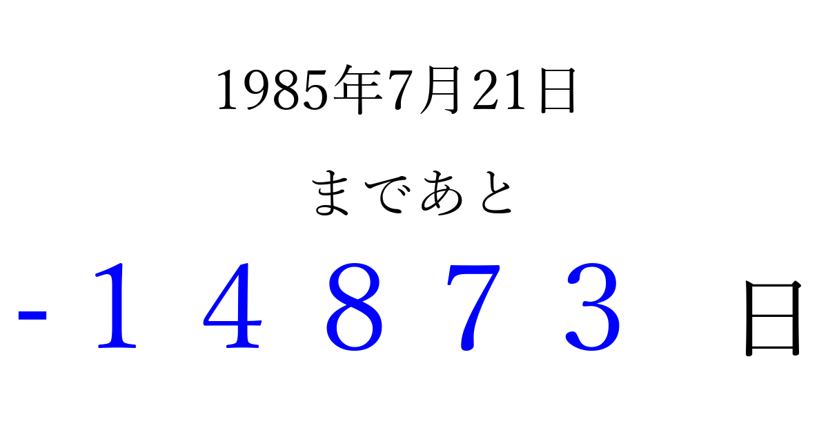 1985年7月21日(日)は もう 00000 日過ぎました 追加すると、トップページからすぐ選べるようになります ※2026/04/10現在の結果です。 最新の状態に更新する ↓シェアして、タイムライン上にカウントダウンを表示しよう!↓ 📤 この結果を共有する Tweet シェア Threads Bluesky 別の日付でカウントダウン 1985年7月のカレンダー このページをブックマークに追加すると、いつでもカウントダウンを確認できます。 (PC: Ctrl+D / Mac: ⌘+D) hitome-notes.comでは以下のページも運営しています。 指定日と期間から日付を計算 | ガチャ確率計算・シミュレーション | プライバシー・ポリシー 運営者:Avocado