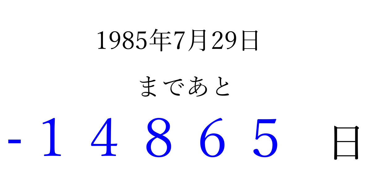 1985年7月29日(月)は もう 00000 日過ぎました 追加すると、トップページからすぐ選べるようになります ※2026/04/10現在の結果です。 最新の状態に更新する ↓シェアして、タイムライン上にカウントダウンを表示しよう!↓ 📤 この結果を共有する Tweet シェア Threads Bluesky 別の日付でカウントダウン 1985年7月のカレンダー このページをブックマークに追加すると、いつでもカウントダウンを確認できます。 (PC: Ctrl+D / Mac: ⌘+D) hitome-notes.comでは以下のページも運営しています。 指定日と期間から日付を計算 | ガチャ確率計算・シミュレーション | プライバシー・ポリシー 運営者:Avocado