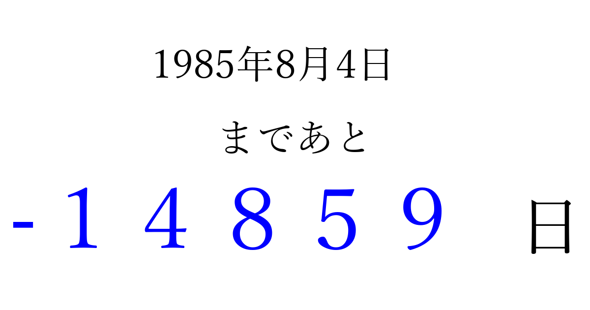 1985年8月4日(日)は もう 00000 日過ぎました 追加すると、トップページからすぐ選べるようになります ※2026/04/10現在の結果です。 最新の状態に更新する ↓シェアして、タイムライン上にカウントダウンを表示しよう!↓ 📤 この結果を共有する Tweet シェア Threads Bluesky 別の日付でカウントダウン 1985年8月のカレンダー このページをブックマークに追加すると、いつでもカウントダウンを確認できます。 (PC: Ctrl+D / Mac: ⌘+D) hitome-notes.comでは以下のページも運営しています。 指定日と期間から日付を計算 | ガチャ確率計算・シミュレーション | プライバシー・ポリシー 運営者:Avocado