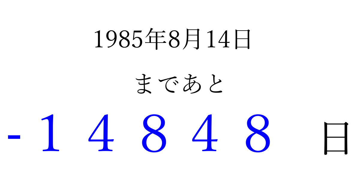1985年8月14日(水)は もう 00000 日過ぎました 追加すると、トップページからすぐ選べるようになります ※2026/04/09現在の結果です。 最新の状態に更新する ↓シェアして、タイムライン上にカウントダウンを表示しよう!↓ 📤 この結果を共有する Tweet シェア Threads Bluesky 別の日付でカウントダウン 1985年8月のカレンダー このページをブックマークに追加すると、いつでもカウントダウンを確認できます。 (PC: Ctrl+D / Mac: ⌘+D) hitome-notes.comでは以下のページも運営しています。 指定日と期間から日付を計算 | ガチャ確率計算・シミュレーション | プライバシー・ポリシー 運営者:Avocado