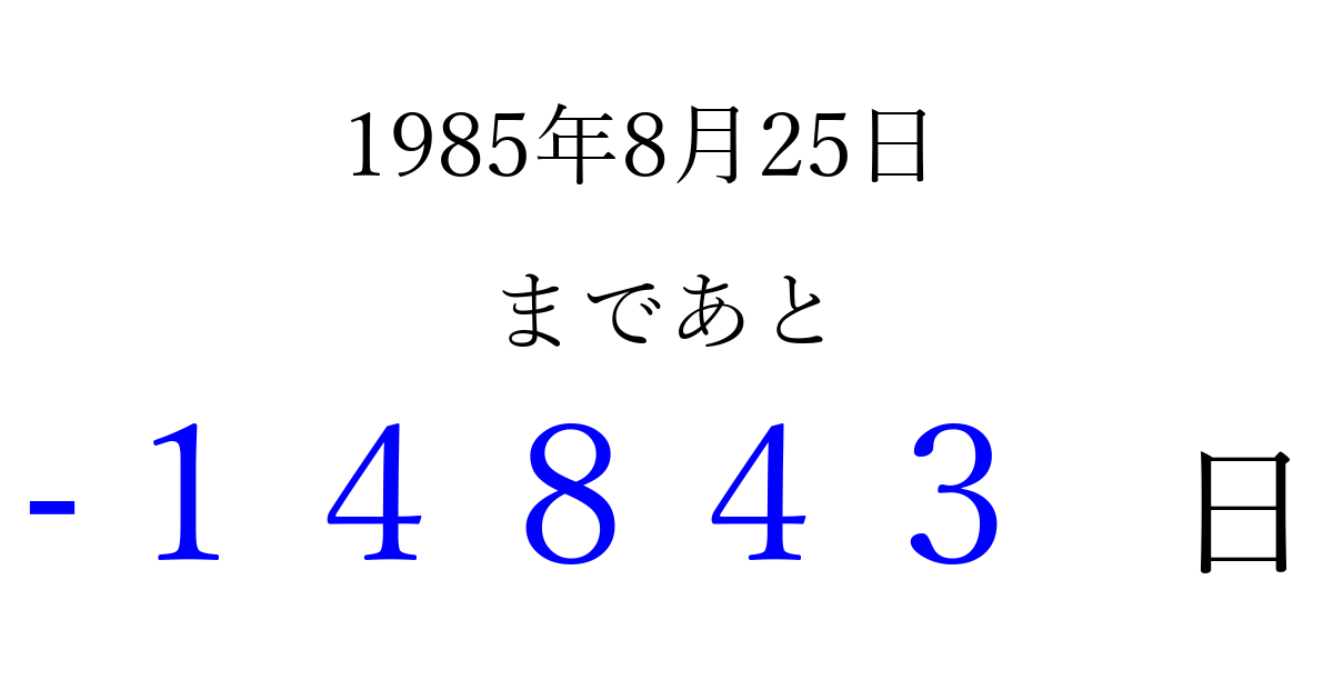 1985年8月25日(日)は もう 00000 日過ぎました 追加すると、トップページからすぐ選べるようになります ※2026/04/15現在の結果です。 最新の状態に更新する ↓シェアして、タイムライン上にカウントダウンを表示しよう!↓ 📤 この結果を共有する Tweet シェア Threads Bluesky 別の日付でカウントダウン 1985年8月のカレンダー このページをブックマークに追加すると、いつでもカウントダウンを確認できます。 (PC: Ctrl+D / Mac: ⌘+D) hitome-notes.comでは以下のページも運営しています。 指定日と期間から日付を計算 | ガチャ確率計算・シミュレーション | プライバシー・ポリシー 運営者:Avocado