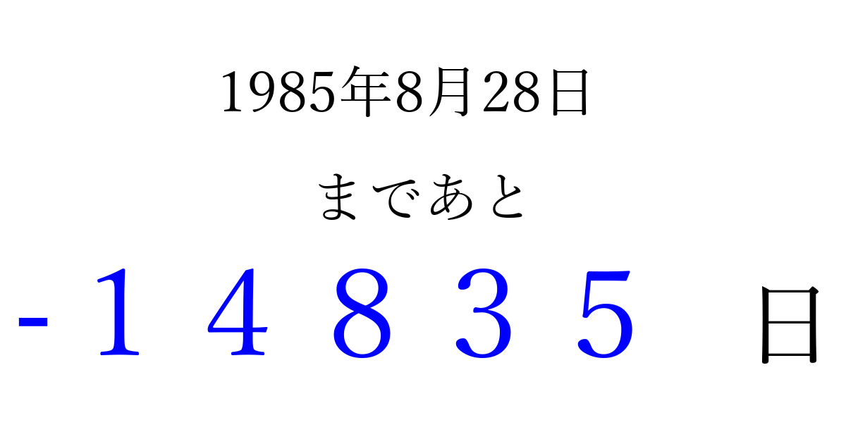 1985年8月28日(水)は もう 00000 日過ぎました 追加すると、トップページからすぐ選べるようになります ※2026/04/10現在の結果です。 最新の状態に更新する ↓シェアして、タイムライン上にカウントダウンを表示しよう!↓ 📤 この結果を共有する Tweet シェア Threads Bluesky 別の日付でカウントダウン 1985年8月のカレンダー このページをブックマークに追加すると、いつでもカウントダウンを確認できます。 (PC: Ctrl+D / Mac: ⌘+D) hitome-notes.comでは以下のページも運営しています。 指定日と期間から日付を計算 | ガチャ確率計算・シミュレーション | プライバシー・ポリシー 運営者:Avocado