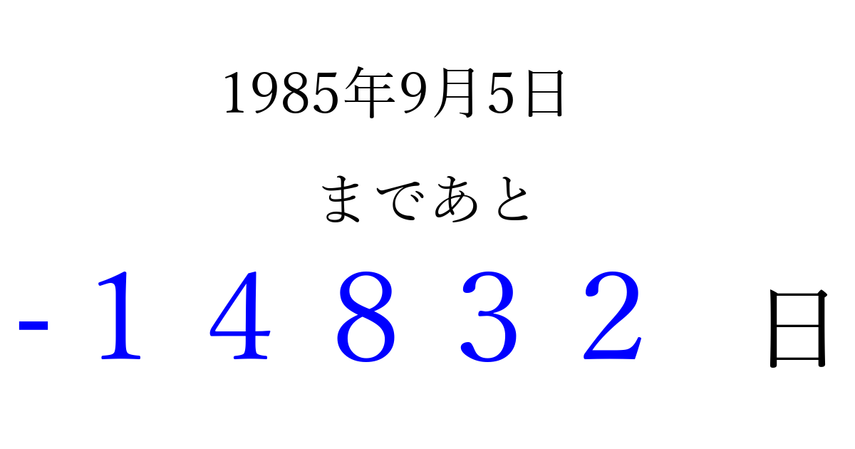 1985年9月5日(木)は もう 00000 日過ぎました 追加すると、トップページからすぐ選べるようになります ※2026/04/15現在の結果です。 最新の状態に更新する ↓シェアして、タイムライン上にカウントダウンを表示しよう!↓ 📤 この結果を共有する Tweet シェア Threads Bluesky 別の日付でカウントダウン 1985年9月のカレンダー このページをブックマークに追加すると、いつでもカウントダウンを確認できます。 (PC: Ctrl+D / Mac: ⌘+D) hitome-notes.comでは以下のページも運営しています。 指定日と期間から日付を計算 | ガチャ確率計算・シミュレーション | プライバシー・ポリシー 運営者:Avocado