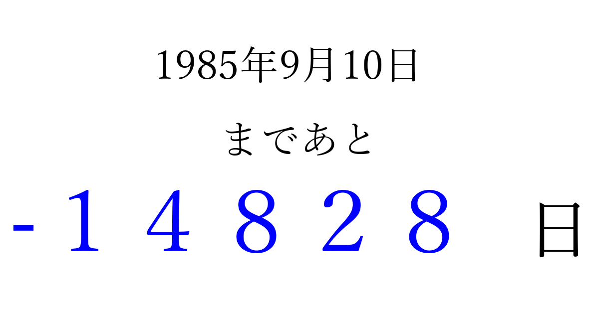 1985年9月10日(火)は もう 00000 日過ぎました 追加すると、トップページからすぐ選べるようになります ※2026/04/16現在の結果です。 最新の状態に更新する ↓シェアして、タイムライン上にカウントダウンを表示しよう!↓ 📤 この結果を共有する Tweet シェア Threads Bluesky 別の日付でカウントダウン 1985年9月のカレンダー このページをブックマークに追加すると、いつでもカウントダウンを確認できます。 (PC: Ctrl+D / Mac: ⌘+D) hitome-notes.comでは以下のページも運営しています。 指定日と期間から日付を計算 | ガチャ確率計算・シミュレーション | プライバシー・ポリシー 運営者:Avocado