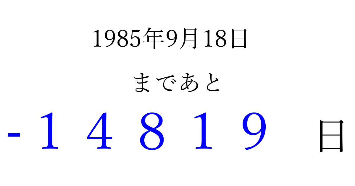 1985年9月18日(水)は もう 00000 日過ぎました 追加すると、トップページからすぐ選べるようになります ※2026/04/15現在の結果です。 最新の状態に更新する ↓シェアして、タイムライン上にカウントダウンを表示しよう!↓ 📤 この結果を共有する Tweet シェア Threads Bluesky 別の日付でカウントダウン 1985年9月のカレンダー このページをブックマークに追加すると、いつでもカウントダウンを確認できます。 (PC: Ctrl+D / Mac: ⌘+D) hitome-notes.comでは以下のページも運営しています。 指定日と期間から日付を計算 | ガチャ確率計算・シミュレーション | プライバシー・ポリシー 運営者:Avocado