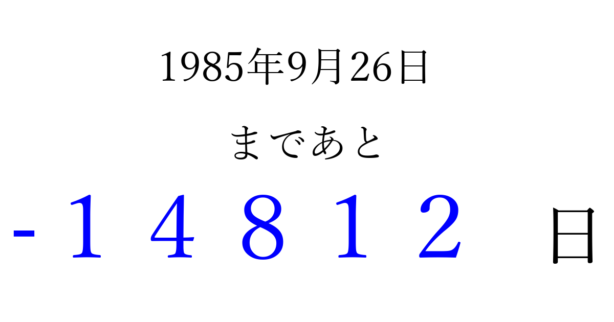 1985年9月26日(木)は もう 00000 日過ぎました 追加すると、トップページからすぐ選べるようになります ※2026/04/16現在の結果です。 最新の状態に更新する ↓シェアして、タイムライン上にカウントダウンを表示しよう!↓ 📤 この結果を共有する Tweet シェア Threads Bluesky 別の日付でカウントダウン 1985年9月のカレンダー このページをブックマークに追加すると、いつでもカウントダウンを確認できます。 (PC: Ctrl+D / Mac: ⌘+D) hitome-notes.comでは以下のページも運営しています。 指定日と期間から日付を計算 | ガチャ確率計算・シミュレーション | プライバシー・ポリシー 運営者:Avocado