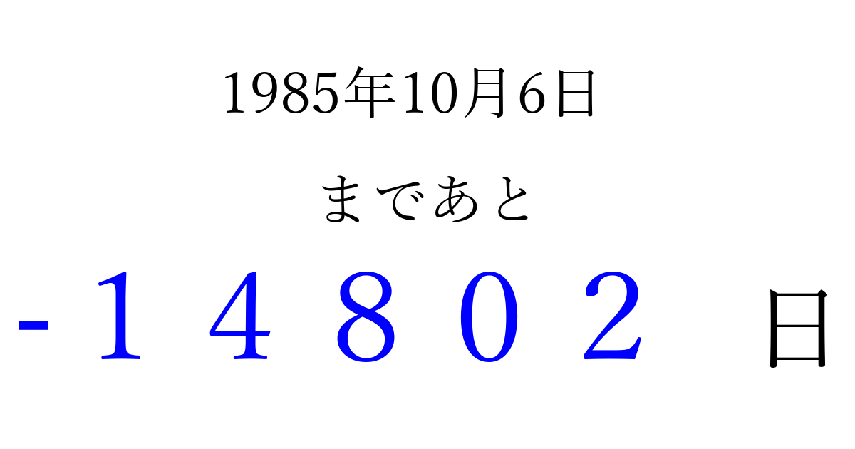 1985年10月6日(日)は もう 00000 日過ぎました 追加すると、トップページからすぐ選べるようになります ※2026/04/16現在の結果です。 最新の状態に更新する ↓シェアして、タイムライン上にカウントダウンを表示しよう!↓ 📤 この結果を共有する Tweet シェア Threads Bluesky 別の日付でカウントダウン 1985年10月のカレンダー このページをブックマークに追加すると、いつでもカウントダウンを確認できます。 (PC: Ctrl+D / Mac: ⌘+D) hitome-notes.comでは以下のページも運営しています。 指定日と期間から日付を計算 | ガチャ確率計算・シミュレーション | プライバシー・ポリシー 運営者:Avocado