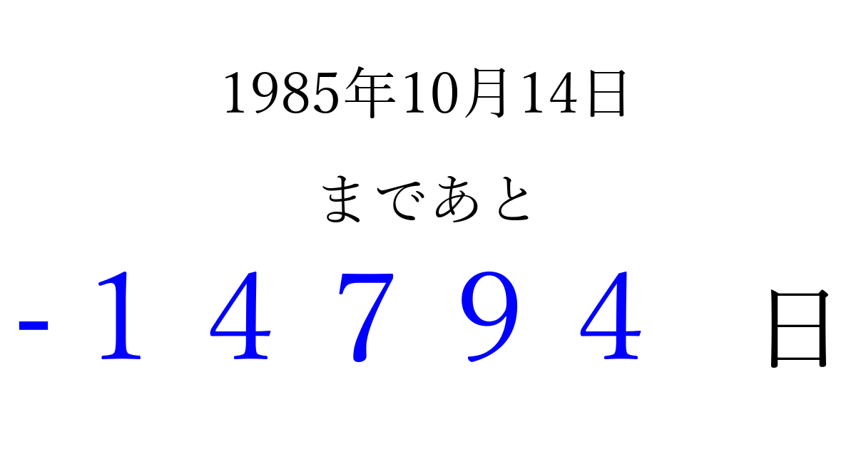 1985年10月14日(月)は もう 00000 日過ぎました 追加すると、トップページからすぐ選べるようになります ※2026/04/16現在の結果です。 最新の状態に更新する ↓シェアして、タイムライン上にカウントダウンを表示しよう!↓ 📤 この結果を共有する Tweet シェア Threads Bluesky 別の日付でカウントダウン 1985年10月のカレンダー このページをブックマークに追加すると、いつでもカウントダウンを確認できます。 (PC: Ctrl+D / Mac: ⌘+D) hitome-notes.comでは以下のページも運営しています。 指定日と期間から日付を計算 | ガチャ確率計算・シミュレーション | プライバシー・ポリシー 運営者:Avocado