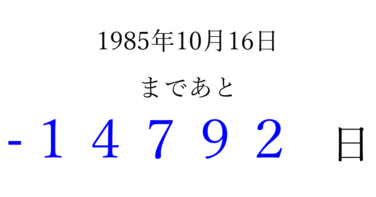 1985年10月16日(水)は もう 00000 日過ぎました 追加すると、トップページからすぐ選べるようになります ※2026/04/16現在の結果です。 最新の状態に更新する ↓シェアして、タイムライン上にカウントダウンを表示しよう!↓ 📤 この結果を共有する Tweet シェア Threads Bluesky 別の日付でカウントダウン 1985年10月のカレンダー このページをブックマークに追加すると、いつでもカウントダウンを確認できます。 (PC: Ctrl+D / Mac: ⌘+D) hitome-notes.comでは以下のページも運営しています。 指定日と期間から日付を計算 | ガチャ確率計算・シミュレーション | プライバシー・ポリシー 運営者:Avocado