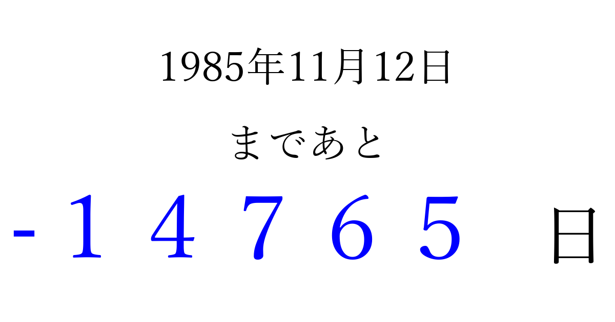 1985年11月12日(火)は もう 00000 日過ぎました 追加すると、トップページからすぐ選べるようになります ※2026/04/16現在の結果です。 最新の状態に更新する ↓シェアして、タイムライン上にカウントダウンを表示しよう!↓ 📤 この結果を共有する Tweet シェア Threads Bluesky 別の日付でカウントダウン 1985年11月のカレンダー このページをブックマークに追加すると、いつでもカウントダウンを確認できます。 (PC: Ctrl+D / Mac: ⌘+D) hitome-notes.comでは以下のページも運営しています。 指定日と期間から日付を計算 | ガチャ確率計算・シミュレーション | プライバシー・ポリシー 運営者:Avocado