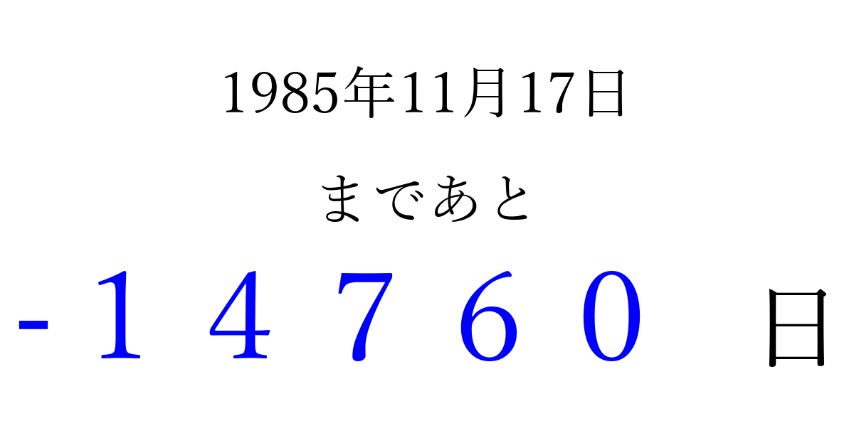 1985年11月17日(日)は もう 00000 日過ぎました 追加すると、トップページからすぐ選べるようになります ※2026/04/16現在の結果です。 最新の状態に更新する ↓シェアして、タイムライン上にカウントダウンを表示しよう!↓ 📤 この結果を共有する Tweet シェア Threads Bluesky 別の日付でカウントダウン 1985年11月のカレンダー このページをブックマークに追加すると、いつでもカウントダウンを確認できます。 (PC: Ctrl+D / Mac: ⌘+D) hitome-notes.comでは以下のページも運営しています。 指定日と期間から日付を計算 | ガチャ確率計算・シミュレーション | プライバシー・ポリシー 運営者:Avocado