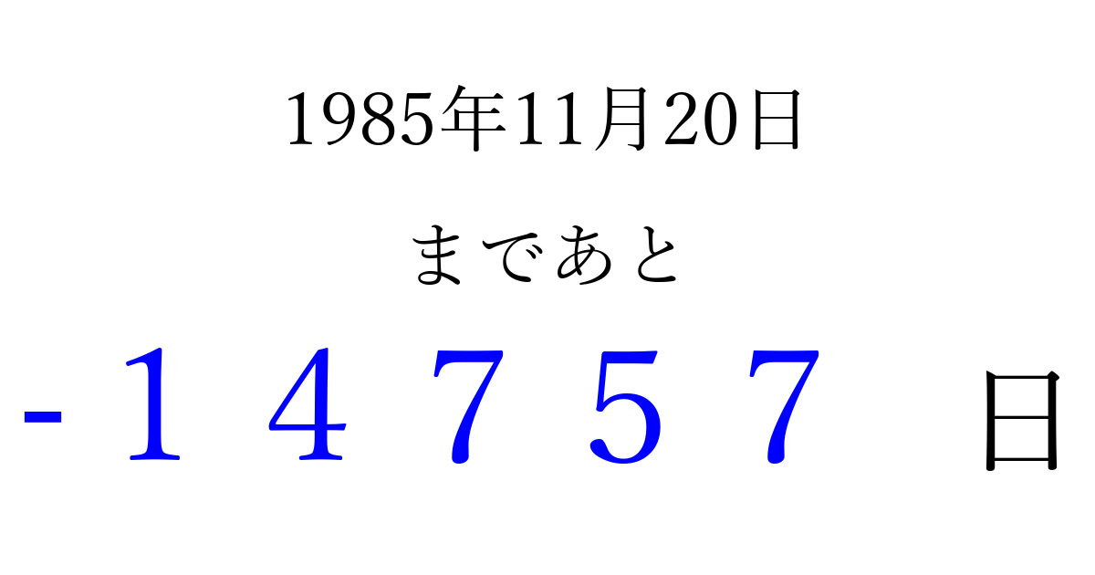 1985年11月20日(水)は もう 00000 日過ぎました 追加すると、トップページからすぐ選べるようになります ※2026/04/16現在の結果です。 最新の状態に更新する ↓シェアして、タイムライン上にカウントダウンを表示しよう!↓ 📤 この結果を共有する Tweet シェア Threads Bluesky 別の日付でカウントダウン 1985年11月のカレンダー このページをブックマークに追加すると、いつでもカウントダウンを確認できます。 (PC: Ctrl+D / Mac: ⌘+D) hitome-notes.comでは以下のページも運営しています。 指定日と期間から日付を計算 | ガチャ確率計算・シミュレーション | プライバシー・ポリシー 運営者:Avocado