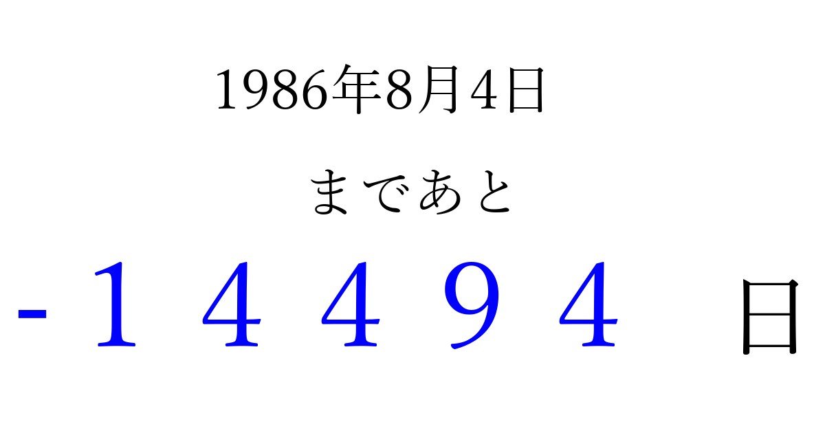 1986年8月4日(月)は もう 00000 日過ぎました 追加すると、トップページからすぐ選べるようになります ※2026/04/10現在の結果です。 最新の状態に更新する ↓シェアして、タイムライン上にカウントダウンを表示しよう!↓ 📤 この結果を共有する Tweet シェア Threads Bluesky 別の日付でカウントダウン 1986年8月のカレンダー このページをブックマークに追加すると、いつでもカウントダウンを確認できます。 (PC: Ctrl+D / Mac: ⌘+D) hitome-notes.comでは以下のページも運営しています。 指定日と期間から日付を計算 | ガチャ確率計算・シミュレーション | プライバシー・ポリシー 運営者:Avocado