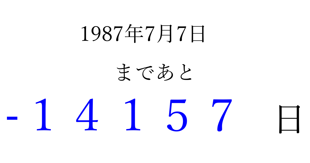 1987年7月7日(火)は もう 00000 日過ぎました 追加すると、トップページからすぐ選べるようになります ※2026/04/10現在の結果です。 最新の状態に更新する ↓シェアして、タイムライン上にカウントダウンを表示しよう!↓ 📤 この結果を共有する Tweet シェア Threads Bluesky 別の日付でカウントダウン 1987年7月のカレンダー このページをブックマークに追加すると、いつでもカウントダウンを確認できます。 (PC: Ctrl+D / Mac: ⌘+D) hitome-notes.comでは以下のページも運営しています。 指定日と期間から日付を計算 | ガチャ確率計算・シミュレーション | プライバシー・ポリシー 運営者:Avocado