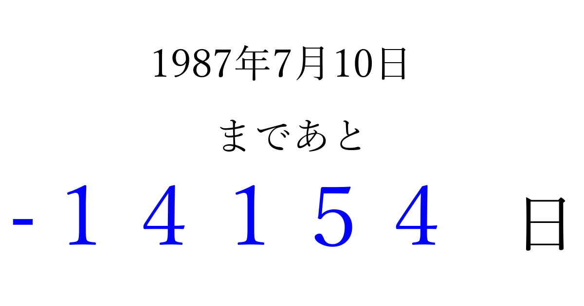 1987年7月10日(金)は もう 00000 日過ぎました 追加すると、トップページからすぐ選べるようになります ※2026/04/10現在の結果です。 最新の状態に更新する ↓シェアして、タイムライン上にカウントダウンを表示しよう!↓ 📤 この結果を共有する Tweet シェア Threads Bluesky 別の日付でカウントダウン 1987年7月のカレンダー このページをブックマークに追加すると、いつでもカウントダウンを確認できます。 (PC: Ctrl+D / Mac: ⌘+D) hitome-notes.comでは以下のページも運営しています。 指定日と期間から日付を計算 | ガチャ確率計算・シミュレーション | プライバシー・ポリシー 運営者:Avocado