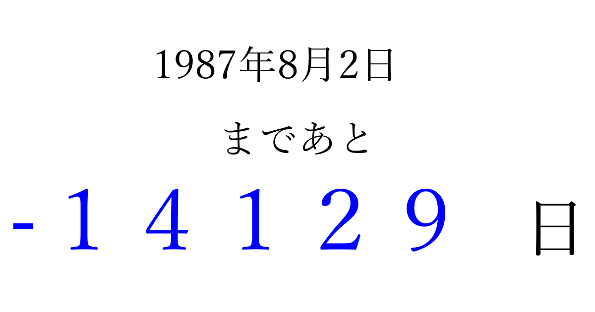 1987年8月2日(日)は もう 00000 日過ぎました 追加すると、トップページからすぐ選べるようになります ※2026/04/08現在の結果です。 最新の状態に更新する ↓シェアして、タイムライン上にカウントダウンを表示しよう!↓ 📤 この結果を共有する Tweet シェア Threads Bluesky 別の日付でカウントダウン 1987年8月のカレンダー このページをブックマークに追加すると、いつでもカウントダウンを確認できます。 (PC: Ctrl+D / Mac: ⌘+D) hitome-notes.comでは以下のページも運営しています。 指定日と期間から日付を計算 | ガチャ確率計算・シミュレーション | プライバシー・ポリシー 運営者:Avocado