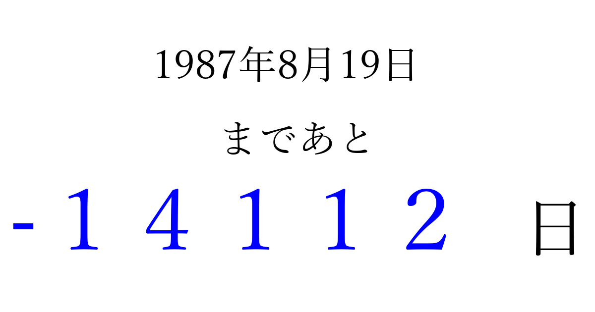 1987年8月19日(水)は もう 00000 日過ぎました 追加すると、トップページからすぐ選べるようになります ※2026/04/08現在の結果です。 最新の状態に更新する ↓シェアして、タイムライン上にカウントダウンを表示しよう!↓ 📤 この結果を共有する Tweet シェア Threads Bluesky 別の日付でカウントダウン 1987年8月のカレンダー このページをブックマークに追加すると、いつでもカウントダウンを確認できます。 (PC: Ctrl+D / Mac: ⌘+D) hitome-notes.comでは以下のページも運営しています。 指定日と期間から日付を計算 | ガチャ確率計算・シミュレーション | プライバシー・ポリシー 運営者:Avocado