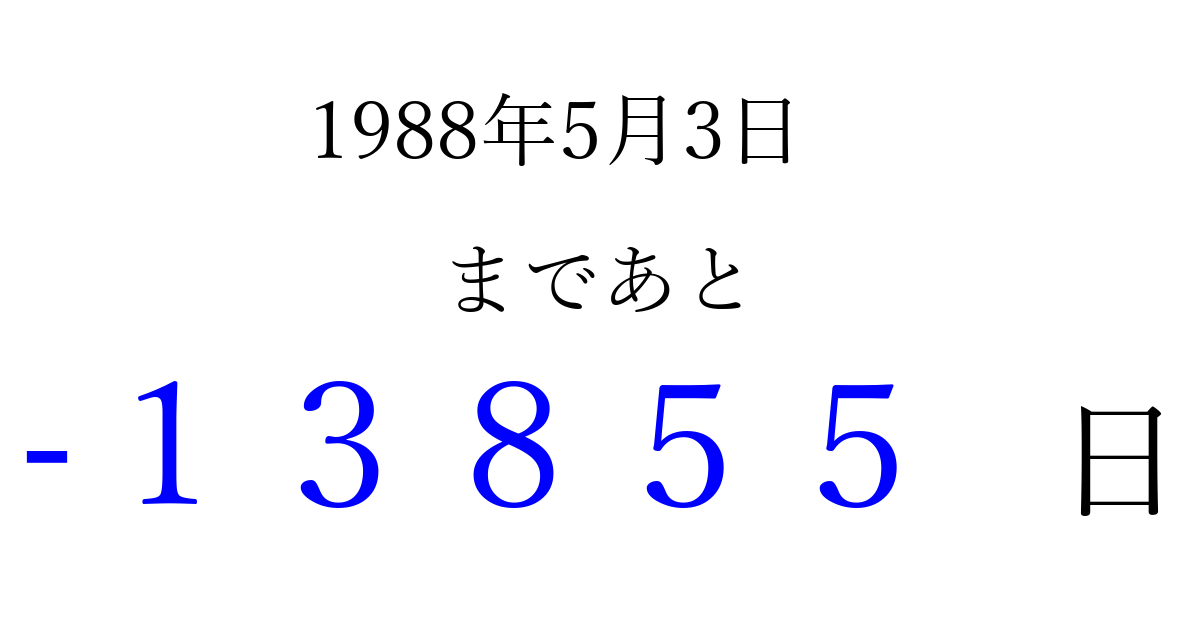 1988年5月3日(火)は もう 00000 日過ぎました 追加すると、トップページからすぐ選べるようになります ※2026/04/09現在の結果です。 最新の状態に更新する ↓シェアして、タイムライン上にカウントダウンを表示しよう!↓ 📤 この結果を共有する Tweet シェア Threads Bluesky 別の日付でカウントダウン 1988年5月のカレンダー このページをブックマークに追加すると、いつでもカウントダウンを確認できます。 (PC: Ctrl+D / Mac: ⌘+D) hitome-notes.comでは以下のページも運営しています。 指定日と期間から日付を計算 | ガチャ確率計算・シミュレーション | プライバシー・ポリシー 運営者:Avocado