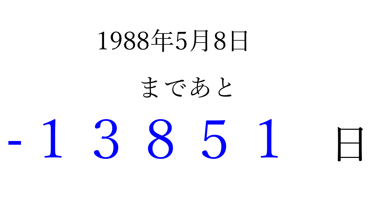 1988年5月8日(日)は もう 00000 日過ぎました 追加すると、トップページからすぐ選べるようになります ※2026/04/10現在の結果です。 最新の状態に更新する ↓シェアして、タイムライン上にカウントダウンを表示しよう!↓ 📤 この結果を共有する Tweet シェア Threads Bluesky 別の日付でカウントダウン 1988年5月のカレンダー このページをブックマークに追加すると、いつでもカウントダウンを確認できます。 (PC: Ctrl+D / Mac: ⌘+D) hitome-notes.comでは以下のページも運営しています。 指定日と期間から日付を計算 | ガチャ確率計算・シミュレーション | プライバシー・ポリシー 運営者:Avocado
