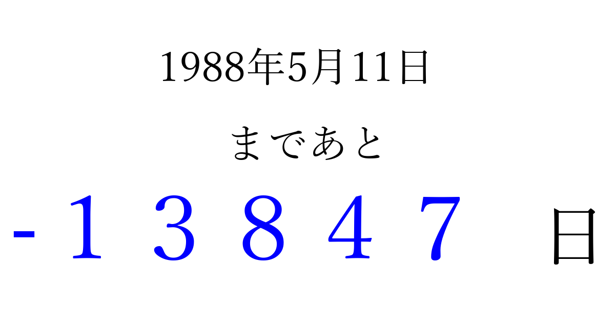 1988年5月11日(水)は もう 00000 日過ぎました 追加すると、トップページからすぐ選べるようになります ※2026/04/09現在の結果です。 最新の状態に更新する ↓シェアして、タイムライン上にカウントダウンを表示しよう!↓ 📤 この結果を共有する Tweet シェア Threads Bluesky 別の日付でカウントダウン 1988年5月のカレンダー このページをブックマークに追加すると、いつでもカウントダウンを確認できます。 (PC: Ctrl+D / Mac: ⌘+D) hitome-notes.comでは以下のページも運営しています。 指定日と期間から日付を計算 | ガチャ確率計算・シミュレーション | プライバシー・ポリシー 運営者:Avocado