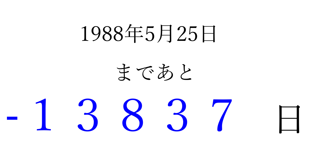 1988年5月25日(水)は もう 00000 日過ぎました 追加すると、トップページからすぐ選べるようになります ※2026/04/13現在の結果です。 最新の状態に更新する ↓シェアして、タイムライン上にカウントダウンを表示しよう!↓ 📤 この結果を共有する Tweet シェア Threads Bluesky 別の日付でカウントダウン 1988年5月のカレンダー このページをブックマークに追加すると、いつでもカウントダウンを確認できます。 (PC: Ctrl+D / Mac: ⌘+D) hitome-notes.comでは以下のページも運営しています。 指定日と期間から日付を計算 | ガチャ確率計算・シミュレーション | プライバシー・ポリシー 運営者:Avocado