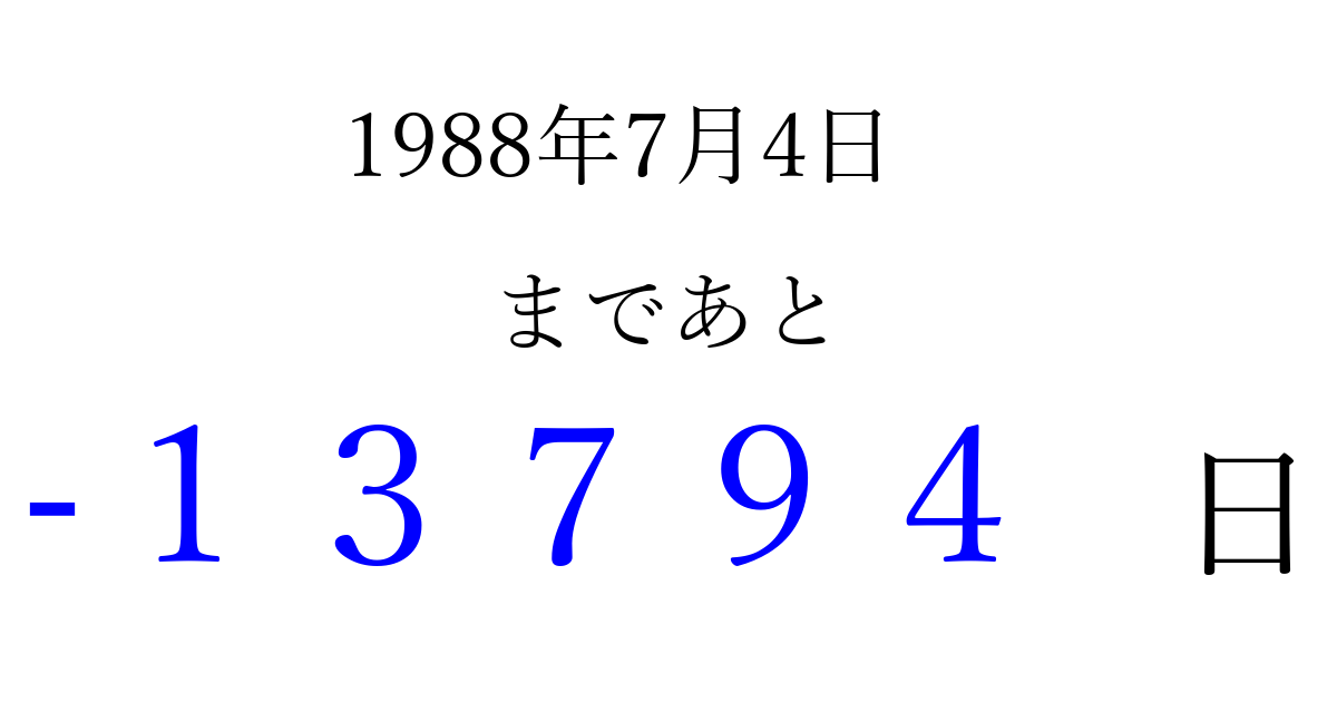 1988年7月4日(月)は もう 00000 日過ぎました 追加すると、トップページからすぐ選べるようになります ※2026/04/10現在の結果です。 最新の状態に更新する ↓シェアして、タイムライン上にカウントダウンを表示しよう!↓ 📤 この結果を共有する Tweet シェア Threads Bluesky 別の日付でカウントダウン 1988年7月のカレンダー このページをブックマークに追加すると、いつでもカウントダウンを確認できます。 (PC: Ctrl+D / Mac: ⌘+D) hitome-notes.comでは以下のページも運営しています。 指定日と期間から日付を計算 | ガチャ確率計算・シミュレーション | プライバシー・ポリシー 運営者:Avocado
