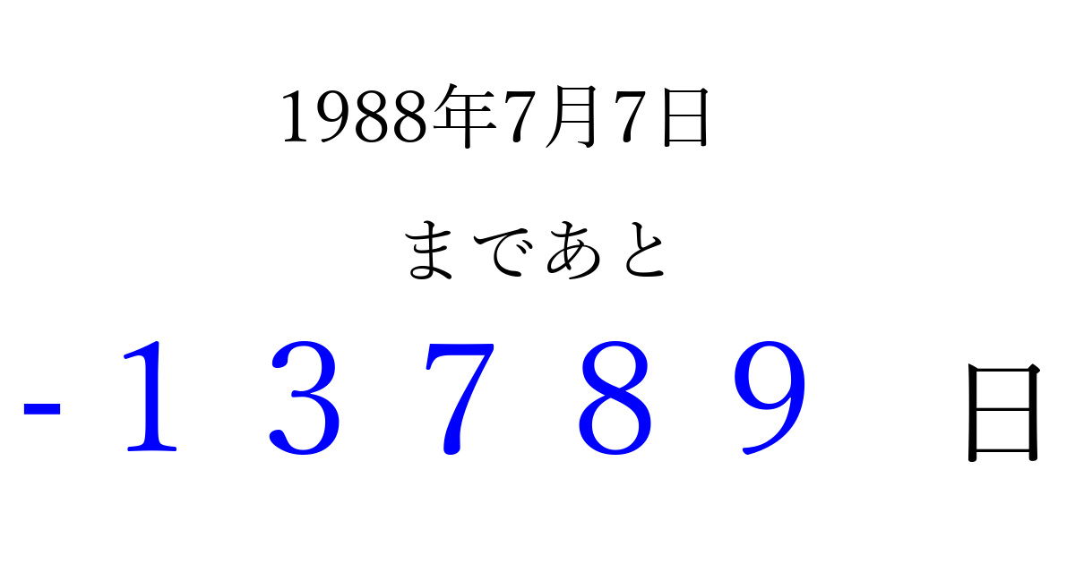 1988年7月7日(木)は もう 00000 日過ぎました 追加すると、トップページからすぐ選べるようになります ※2026/04/08現在の結果です。 最新の状態に更新する ↓シェアして、タイムライン上にカウントダウンを表示しよう!↓ 📤 この結果を共有する Tweet シェア Threads Bluesky 別の日付でカウントダウン 1988年7月のカレンダー このページをブックマークに追加すると、いつでもカウントダウンを確認できます。 (PC: Ctrl+D / Mac: ⌘+D) hitome-notes.comでは以下のページも運営しています。 指定日と期間から日付を計算 | ガチャ確率計算・シミュレーション | プライバシー・ポリシー 運営者:Avocado