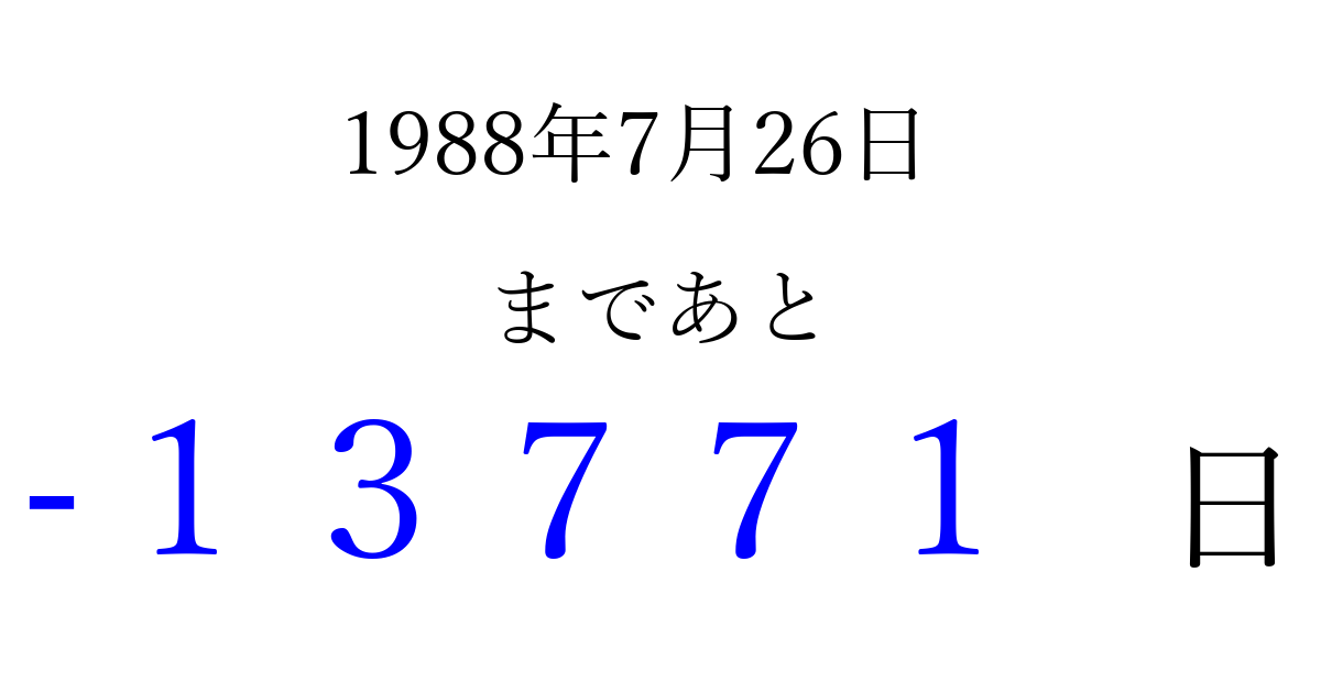 1988年7月26日(火)は もう 00000 日過ぎました 追加すると、トップページからすぐ選べるようになります ※2026/04/09現在の結果です。 最新の状態に更新する ↓シェアして、タイムライン上にカウントダウンを表示しよう!↓ 📤 この結果を共有する Tweet シェア Threads Bluesky 別の日付でカウントダウン 1988年7月のカレンダー このページをブックマークに追加すると、いつでもカウントダウンを確認できます。 (PC: Ctrl+D / Mac: ⌘+D) hitome-notes.comでは以下のページも運営しています。 指定日と期間から日付を計算 | ガチャ確率計算・シミュレーション | プライバシー・ポリシー 運営者:Avocado