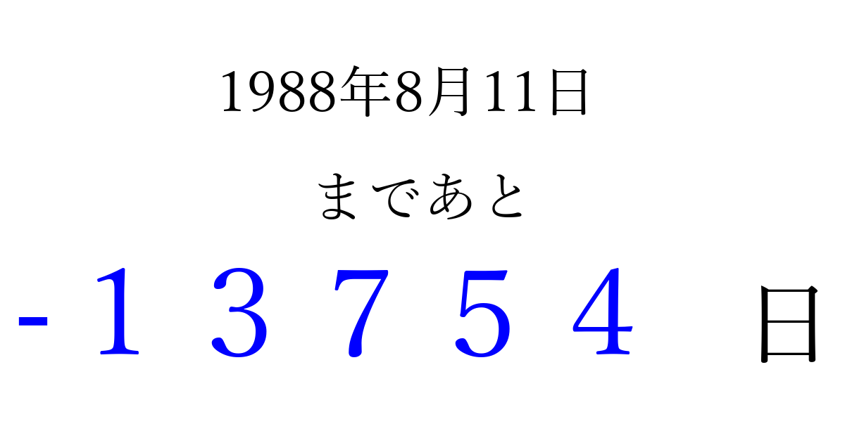 1988年8月11日(木)は もう 00000 日過ぎました 追加すると、トップページからすぐ選べるようになります ※2026/04/08現在の結果です。 最新の状態に更新する ↓シェアして、タイムライン上にカウントダウンを表示しよう!↓ 📤 この結果を共有する Tweet シェア Threads Bluesky 別の日付でカウントダウン 1988年8月のカレンダー このページをブックマークに追加すると、いつでもカウントダウンを確認できます。 (PC: Ctrl+D / Mac: ⌘+D) hitome-notes.comでは以下のページも運営しています。 指定日と期間から日付を計算 | ガチャ確率計算・シミュレーション | プライバシー・ポリシー 運営者:Avocado