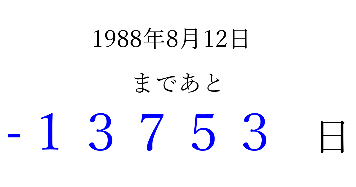 1988年8月12日(金)は もう 00000 日過ぎました 追加すると、トップページからすぐ選べるようになります ※2026/04/08現在の結果です。 最新の状態に更新する ↓シェアして、タイムライン上にカウントダウンを表示しよう!↓ 📤 この結果を共有する Tweet シェア Threads Bluesky 別の日付でカウントダウン 1988年8月のカレンダー このページをブックマークに追加すると、いつでもカウントダウンを確認できます。 (PC: Ctrl+D / Mac: ⌘+D) hitome-notes.comでは以下のページも運営しています。 指定日と期間から日付を計算 | ガチャ確率計算・シミュレーション | プライバシー・ポリシー 運営者:Avocado