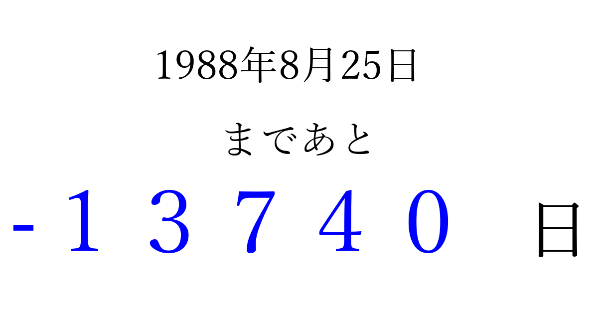 1988年8月25日(木)は もう 00000 日過ぎました 追加すると、トップページからすぐ選べるようになります ※2026/04/08現在の結果です。 最新の状態に更新する ↓シェアして、タイムライン上にカウントダウンを表示しよう!↓ 📤 この結果を共有する Tweet シェア Threads Bluesky 別の日付でカウントダウン 1988年8月のカレンダー このページをブックマークに追加すると、いつでもカウントダウンを確認できます。 (PC: Ctrl+D / Mac: ⌘+D) hitome-notes.comでは以下のページも運営しています。 指定日と期間から日付を計算 | ガチャ確率計算・シミュレーション | プライバシー・ポリシー 運営者:Avocado