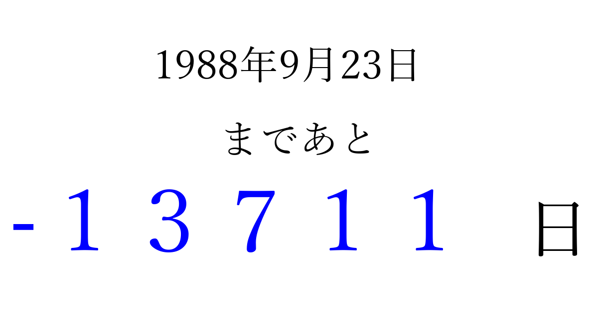 1988年9月23日(金)は もう 00000 日過ぎました 追加すると、トップページからすぐ選べるようになります ※2026/04/08現在の結果です。 最新の状態に更新する ↓シェアして、タイムライン上にカウントダウンを表示しよう!↓ 📤 この結果を共有する Tweet シェア Threads Bluesky 別の日付でカウントダウン 1988年9月のカレンダー このページをブックマークに追加すると、いつでもカウントダウンを確認できます。 (PC: Ctrl+D / Mac: ⌘+D) hitome-notes.comでは以下のページも運営しています。 指定日と期間から日付を計算 | ガチャ確率計算・シミュレーション | プライバシー・ポリシー 運営者:Avocado