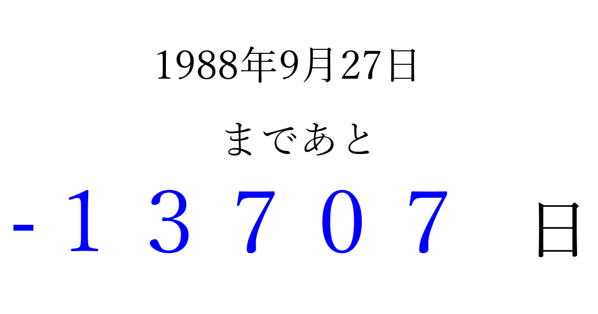 1988年9月27日(火)は もう 00000 日過ぎました 追加すると、トップページからすぐ選べるようになります ※2026/04/08現在の結果です。 最新の状態に更新する ↓シェアして、タイムライン上にカウントダウンを表示しよう!↓ 📤 この結果を共有する Tweet シェア Threads Bluesky 別の日付でカウントダウン 1988年9月のカレンダー このページをブックマークに追加すると、いつでもカウントダウンを確認できます。 (PC: Ctrl+D / Mac: ⌘+D) hitome-notes.comでは以下のページも運営しています。 指定日と期間から日付を計算 | ガチャ確率計算・シミュレーション | プライバシー・ポリシー 運営者:Avocado