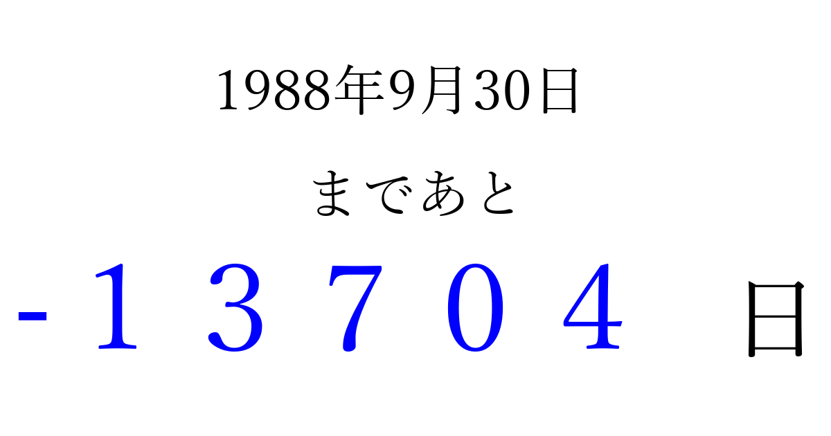 1988年9月30日(金)は もう 00000 日過ぎました 追加すると、トップページからすぐ選べるようになります ※2026/04/08現在の結果です。 最新の状態に更新する ↓シェアして、タイムライン上にカウントダウンを表示しよう!↓ 📤 この結果を共有する Tweet シェア Threads Bluesky 別の日付でカウントダウン 1988年9月のカレンダー このページをブックマークに追加すると、いつでもカウントダウンを確認できます。 (PC: Ctrl+D / Mac: ⌘+D) hitome-notes.comでは以下のページも運営しています。 指定日と期間から日付を計算 | ガチャ確率計算・シミュレーション | プライバシー・ポリシー 運営者:Avocado